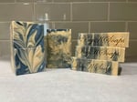 Aqua di Gio….. dupe scent from the famous, oldie but a goodie!, Aqua di Gio cologne . Scents of bergamot, neroli, tangerine, rosemary, jasmine, persimmon, and patchouli. Saponified oils of olive oil, coconut oil, palm oil, organic canola oil, apricot kernel oil, and castor oils. Mango and shea butter! Distilled water, goat milk, sodium hydroxide, sodium lactate. Lovely kaolin Clay, colloidal oats, and tussah silk complete this artisan spa soap. natural blue micas and titanium dioxide for color. If the bar is too big, for a better palm feel, you can cut the bar in half. This listing is for 1 bar of soap. Since my products are all handmade, hand-poured, and hand-cut no two bars of soaps will look exactly the same. As colors, patterns, and shape can and do vary from batch to batch, please expect differences in my designs from time to time. To ensure that this artisan soap will last please keep soap dry in between uses by placing it on a draining soap dish or soap sponge.